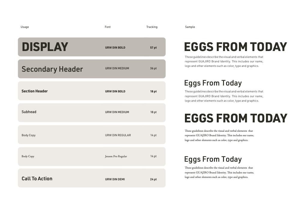 The usage guide on the right shows the best practices for setting the type for most GUAJIRO communications. The only derivation from this would be instances of large, longer copies that can be put in URW DIN rather than JENSON.